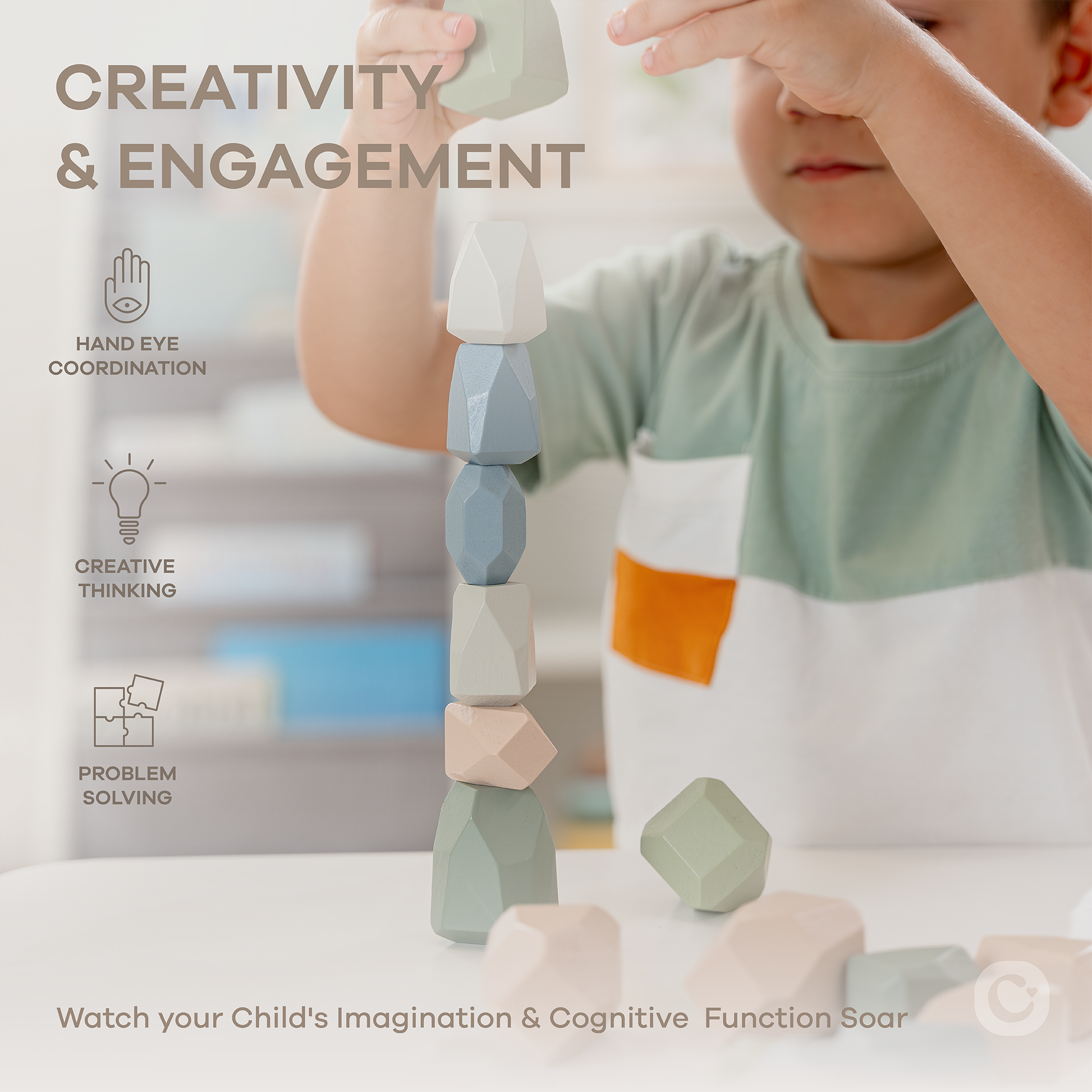 Watch your Child's Imagination Soar: See the joy and wonder in their eyes as they build, create, and explore with 36 colorful wooden stacking rocks. Comfy Cubs toy rocks are designed to stimulate their creativity and enhance their playtime experiences.